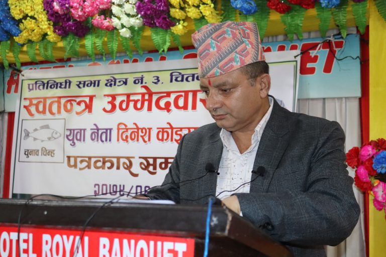 चितवन ३ बाट प्रतिनिधि सभा सदस्यका लागि स्वतन्त्र उम्मेदवारी दिएका दिनेश कोइरालाले अंश, वंश र अर्थको भरमा राजनीति चल्न नदिइने बताएका छन् । कोइरालाले शुक्रबार पत्रकार सम्मेलनको आयोजना गरी ३० वर्षे राजनीतिक यात्रालाई दाउमा राखेर विकृत प्रथाविरुद्ध स्वतन्त्र उम्मेदवारी दिएको बताए ।
