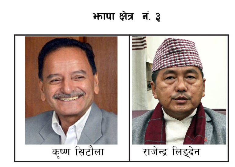 यस पटकको निर्वाचनमा पनि एमालेसँग चुनावी तालमेल गर्दै राप्रपा अध्यक्ष समेत रहनुभएका लिङ्देन मैदानमा हुनुहुन्छ। उहाँ आफ्नो विरासत कायम राख्न प्रयासरत हुनुहुन्छ। भने कांग्रेस नेता सिटौला बदला लिने दाउमा हुनुहुन्छ। तर मनन गर्न पर्ने कुरा के छ भने झापा ३ मा राप्रपा र नेकपा (एमाले) बीचमा गठबन्धन भएपनि एमाले नेता डम्मर गिरीको स्वतन्त्र उम्मेद्वारी परेको छ।