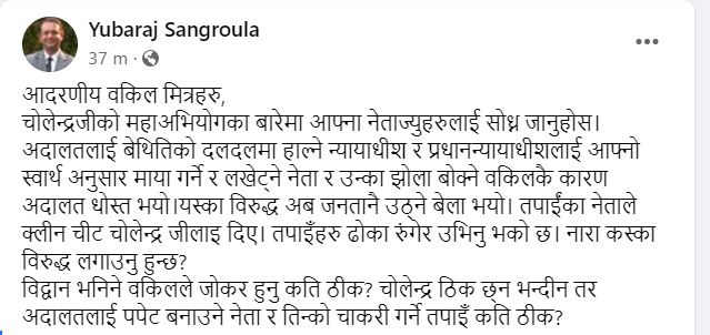 कानुन व्यवसायीलाई सम्बोधन गर्दै संग्रौलाले फेसबुकमा लेखेका छन् :