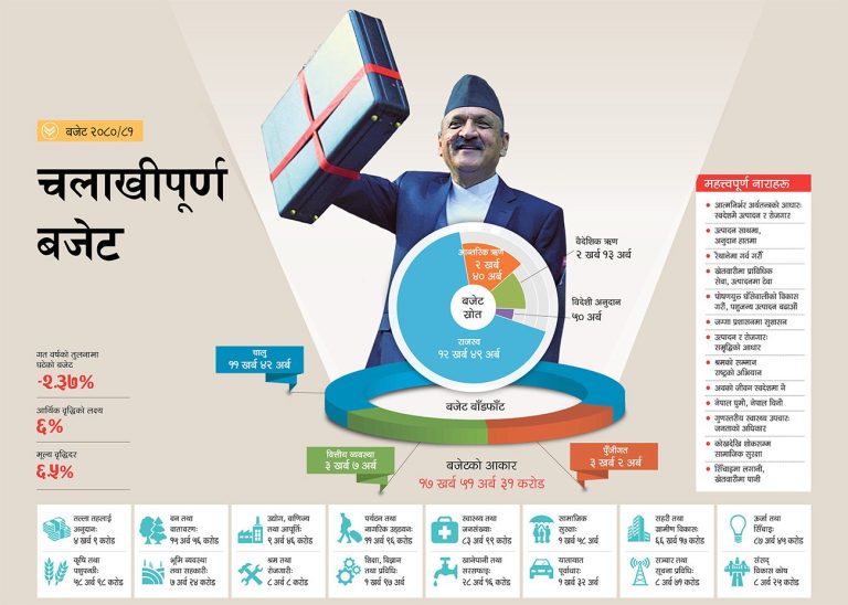काठमाडौं : सरकारले आगामी आर्थिक वर्ष २०८०/८१ को बजेट सार्वजनिक गरेको छ। अर्थमन्त्री डा. प्रकाशशरण महतले संघीय संसद्को संयुक्त सदनमा १७ खर्ब ५१ अर्ब ३१ करोड रुपैयाँको बजेट प्रस्तुत गरेका हुन्।