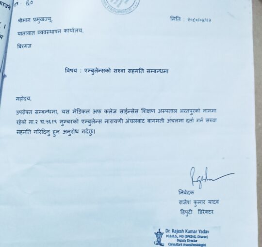 विसं. २०६९ मा भारत सरकारले कलेज अफ मेडिकल साइन्स, भरतपुर चितवन (पुरानो मेडिकल कलेज) लाई सहयोगस्वरूप दिएको र नियमानुसार लाग्ने भन्सार तथा करमा नेपाल सरकारले कर छुट दिएको एम्बुलेन्स नियम अनुसार अहिले पत्रु बनाउनुपर्ने हो। २०६९ असार २६ गते नारायणी यातायात कार्यालयमा ना २ च ५६१६ नम्बरमा दर्ता भएको तर पाँच वर्षदेखि नवीकरणसमेत नभएको एम्बुलेन्स राष्ट्रिय एम्बुलेन्स निर्देशिकाविपरीत २०७९ साउन १४ गते नवीकरण गरेर गैरकानुनी रूपमा प्रयोगमा ल्याइएको छ। सेतो रङको विवरणसहित दर्ता भएको एम्बुलेन्स गैरकानुनी रूपमा रङ परिवर्तन गरी प्रयोगमा ल्याइएको हो।