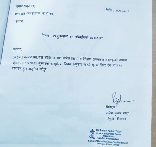 यातायात व्यवस्था कार्यालय वीरगन्जका कार्यालय प्रमुख उमेश रेग्मीले अस्पतालले एम्बुलेन्सको रङ फेर्न निवेदन दिएको बताउँदै भन्नुभयो, “तर, अझैसम्म रङ फेर्न स्वीकृति दिइएको छैन।” काजगपत्रमा सेतो रङको सो एम्बुलेन्समा नीलो रङ लगाइएको छ। त्यसको दर्ता नारायणीबाट बागमतीमा स्थानान्तरण गर्न निवेदन दिइए पनि त्यसका लागि अझैसम्म स्वीकृति दिइएको छैन।