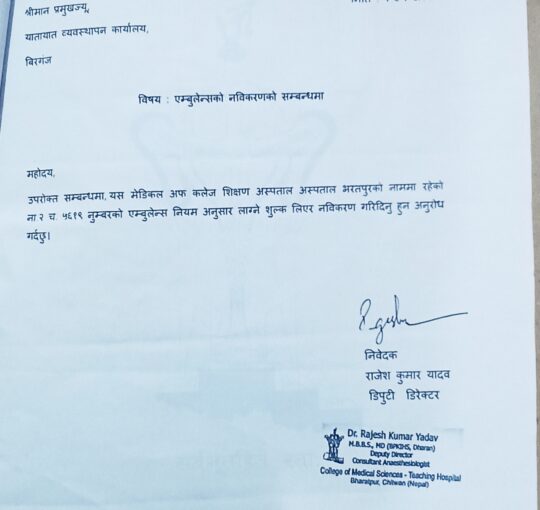 दर्ता नवीकरणका लागि नारायणी यातायात कार्यालय वीरगन्जमा निवेदन दिँदा पुरानो मेडिकल कलेजले रङ परिवर्तन गर्न र नारायणीबाट बागमतीमा दर्ता स्थानान्तरणका लागि निवेदन दिएको भए पनि ती दुई निवेदनमा यातायात कार्यालयले कुनै निर्णय नदिएर खालि जरिबानासहित पाँच वर्षको नवीकरण मात्र गरेको छ। नवीकरण नभएको अवस्थामा पनि पुरानो मेडिकल कलेजले उक्त एम्बुलेन्सको दुरुपयोग गरेको थियो। त्यस बेला उक्त एम्बुलेन्स अस्पतालका कर्मचारी बोक्ने प्रयोजनमा मात्र प्रयोग भएको थियो।