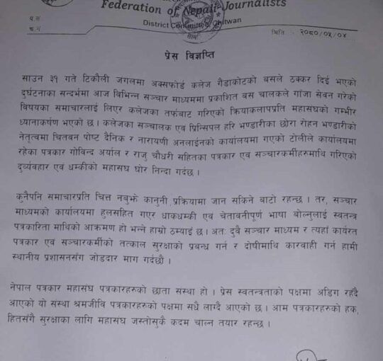 कलेजका सञ्चालक एवं प्रिन्सिपल हरि भण्डारीका छोरा रोहन भण्डारीको नेतृत्वमा नारायणी अनलाईन र चितवन पोष्ट दैनिकको कार्यालयमा गएको टोलीले कार्यालयमा रहेका पत्रकार राजु चौधरी र गोविन्द अर्याल सहितका पत्रकार एवं सञ्चारकर्मीहरुमाथि गरिएको दुव्र्यवहार एवं धम्कीको महासंघले घोर निन्दा गरेको छ ।