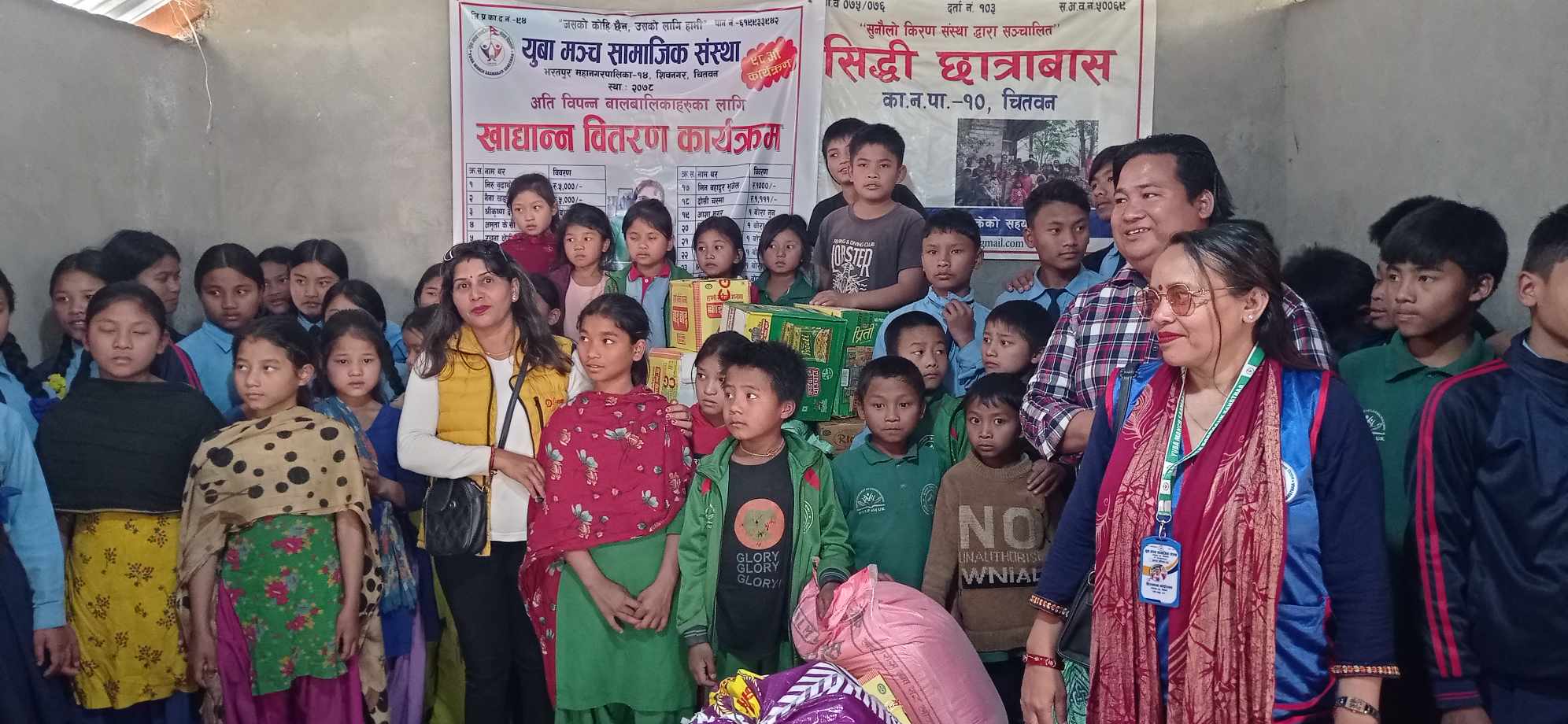 चितवनको कालिका नगरपालिका वडा नम्बर १० स्थित सिद्दी छात्रावासका विद्यार्थीहरु लाई युवा मञ्च सामाजिक संस्थाको अगुवाईमा आज एक कार्यक्रमका बिच खाद्यान्न सहयोग हस्तान्तरण गरिएको छ । छात्राबासका प्रमुख भरत चेपाङले खाद्यान्नको अभावले विद्यार्थीहरु भोकै बस्नु पर्ने अवस्था सिर्जना भएको भन्दै सामाजिक संजालमा सहयोगको अपिल गरेपछी युवा मञ्चको समन्वय र विभिन्न दाताहरुको सहयोगमा खाद्य सामाग्री सहयोग हस्तान्तरण गरिएको हो । हस्तान्तरण कार्यक्रममा प्रमुख अतिथी सामाजिक अगुवा लक्ष्मण गौतम र बिशिष्ठ अतिथी सिद्दी छात्राबासका प्रमुख भरत चेपाङ तथा युवा मञ्चका विभिन्न पदाधिकारी आतिथी रहनु भएको थियो । हस्तान्तरण कार्यक्रममा छात्राबासमा अभाब रहेको चामल , दाल, तेल, भुजा , नुन ,चाउचाउ , तरकारी लगायतको करिव ६२ हजार रुपैया बराबरको खाद्य सामाग्री हस्तान्तरण गरिएको हो । संस्थाका अगुवा राजु खरेलले संचालन गर्नु भएको कार्यक्रम अध्यक्ष तुलसी प्रसाद भट्टको सभापतित्वमा सम्पन्न भएको हो । कार्यक्रमका सभापति भट्ट्ले आगामी दिनमा समेत सहयोग गर्ने बताउदै बालबालिकाको भबिष्य सुनिश्चित गर्न सबैको सहयोग आबश्यक भएको बताउनु भयो । सहयोग हस्तान्तरण कार्यक्रममा छात्राबासका प्रमुख चेपाङ ले आभार ब्यक्त गर्दै विद्यार्थीहरुको पढने र बाच्न पाउने अधिकार लाई सहयोग पुर्याउन अपिल गर्नु भएको थियो । छात्रावासमा हाल विभिन्न स्थानमा घर भै बिपन्न , जोखिममा परेका, अभिभावक बिहिन ५४ जना बालबालिका रहेका छ्न । उनिहरु सोही स्थानको विभिन्न कक्षामा अध्यन गर्ने गरेका छ्न ।