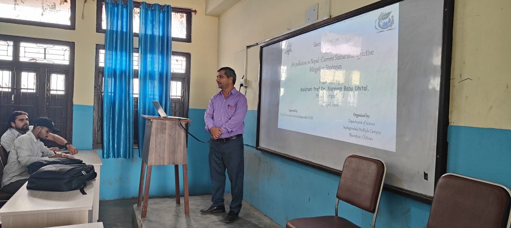 कार्यक्रममा बोल्दै क्याम्पसका सहायक प्रमुख गोविन्द पराजुलीले वायु प्रदूषण न्यूनीकरणका लागि सामूहिक सचेतना र पहल आवश्यक रहेको बताउनुभयो । विज्ञान विभाग प्रमुख रविराज सुवेदीले वातावरण संरक्षणमा व्यक्तिगत स्तरबाटै प्रयास सुरु गर्नुपर्नेमा जोड दिनुभयो । सप्तगण्डकी बहुमुखी क्याम्पसको विज्ञान विभागद्वारा आयोजित उक्त कार्यक्रमको सञ्चालन उप-प्राध्यापक ध्रुव आचार्यले गर्नुभएको थियो भने ‘क्लब अफ इन्भायरोन्मेन्ट साइन्स’ (CESS) ले सहकार्य गरेको थियो । कार्यक्रममा वातावरणीय विज्ञान बिषय र ग्रामिण विकास विषयका गरी ३५ जना भन्दा बढी बिद्यार्थीको सहभागिता रहेको थियो ।